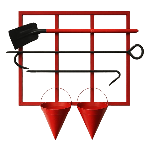 სახანძრო სტენდის კომპლექტში შედის: სახანძრო ფარი, ნიჩაბი, ბაგორი, ძალაყინი და ორი კონუსური სათლი.
