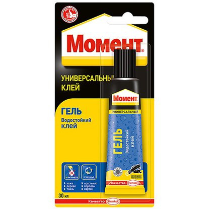Moment Gel – a glue, which is ideal for combined gluing of soft wooden typolivinylchloride, polystyrol, organic pane and other plastics, wood, rubber, paper, plasterboard, leather, tissue, foam rubber, porcelain, ceramics, foamed materials, metals and many other materials, except the dishes getting in contact with food, styropor, polyethylene and polypropylene.